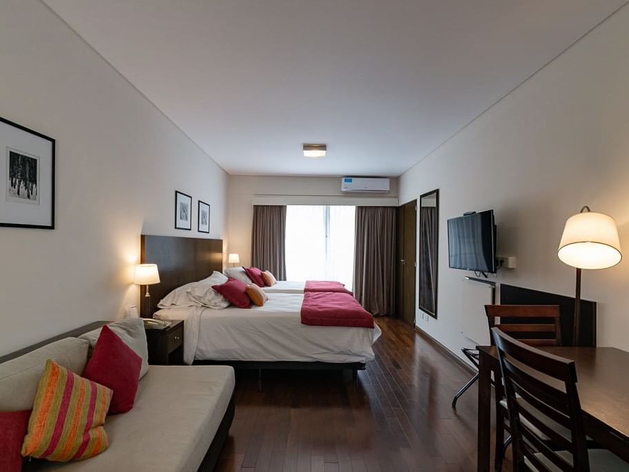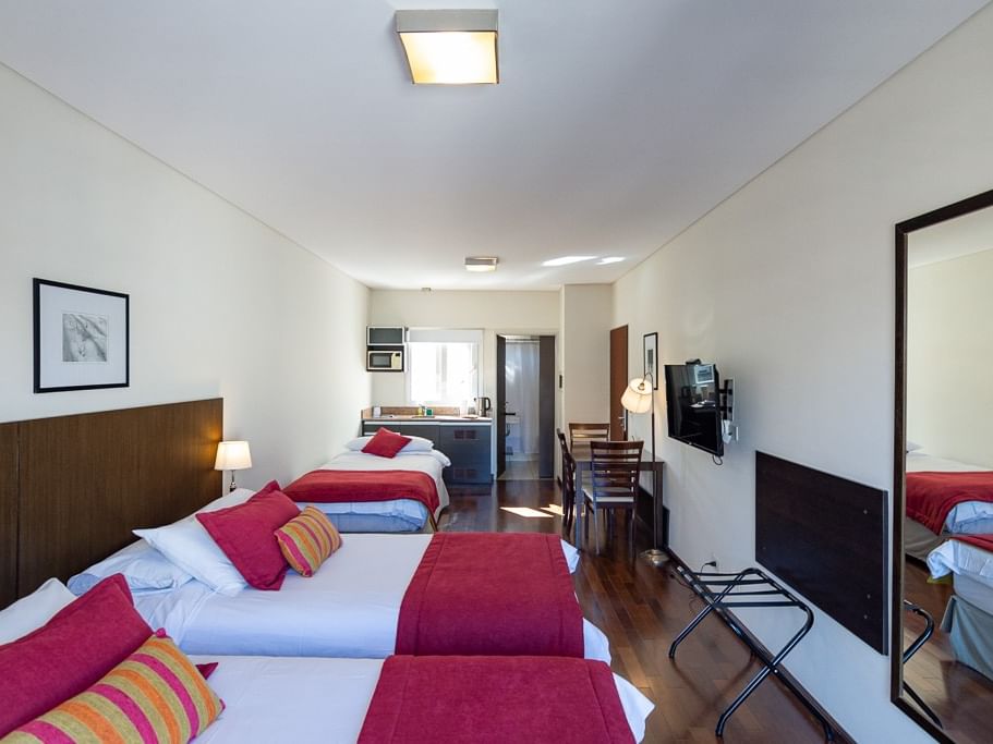 Midiendo 30m2 más balcón, nuestra Junior Suite Triple cuenta con tres camas twin (o una cama king más una cama twin), pisos de madera, smart TV, microondas, calefacción eléctrica, frigobar, kitchenette, vajilla, café y té de cortesía, así como también aire acondicionado frío/calor.