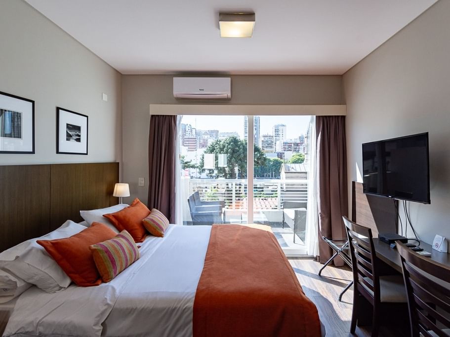 Con una superficie de 25m2 más balcón, nuestra Suite Studio cuenta con una cama queen, pisos de madera, smart TV, kitchenette, un microondas, pava eléctrica, frigobar y vajilla, té y café gratis, así como aire acondicionado.