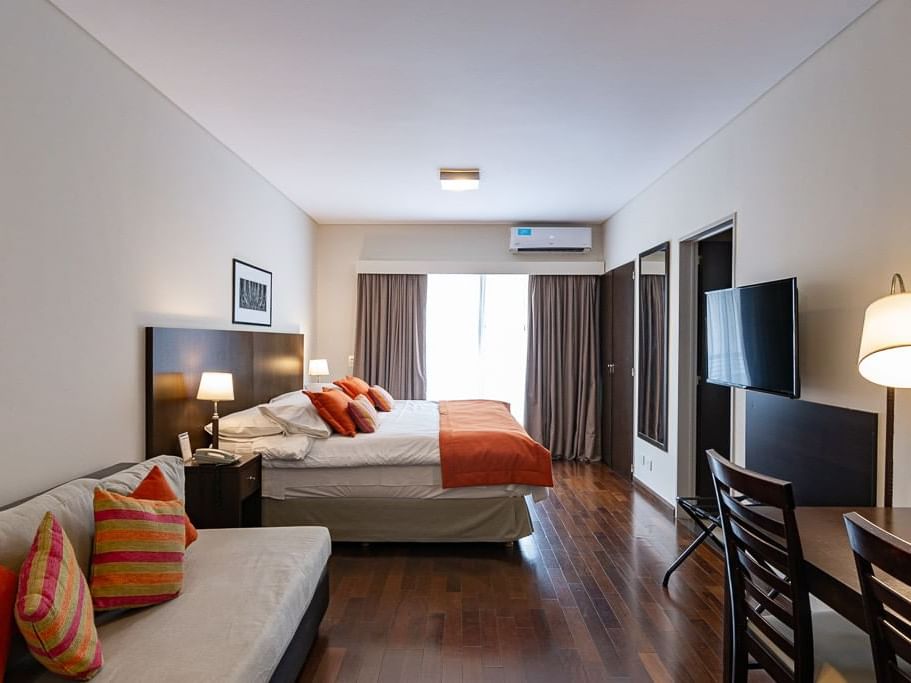 Con una superficie de 55m2 más balcón, nuestra Senior Suite es un departamento de 2 ambientes con pisos de madera, smart TV, kitchenette, microondas, pava eléctrica, frigobar y vajilla, té y café gratuitos, así como aire acondicionado. El dormitorio cuenta con una cama king o dos camas twin.